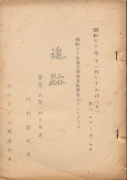 - 東京、大阪の両都市で暗躍する密輸団の犯人を追跡する物語。東京のスタジオと月島桟橋、大阪のスタジオと道頓堀太左衛門橋を結んだ4元生放送のドラマである。テレビカメラ11台、マイク26本、出演者を含めてスタッフ300名を動員。テレビ開局2年目にして、当時の最先端の技術を駆使してテレビの可能性に挑戦した。テレビの特徴である即時性を発揮して、映画とも演劇とも違うテレビドラマの世界を目指し、見事にそれを実現している。テレビ作品としては初めての芸術祭賞受賞作品となった。 脚本は内村直也、出演は東京が二本柳寛、広岡三栄子、芦田伸介、小泉博ほか、大阪が原聖四郎、楠義孝、喜多川千鶴、福山博寿ほか。演出は東京が永山弘、大阪が小泉祐治。